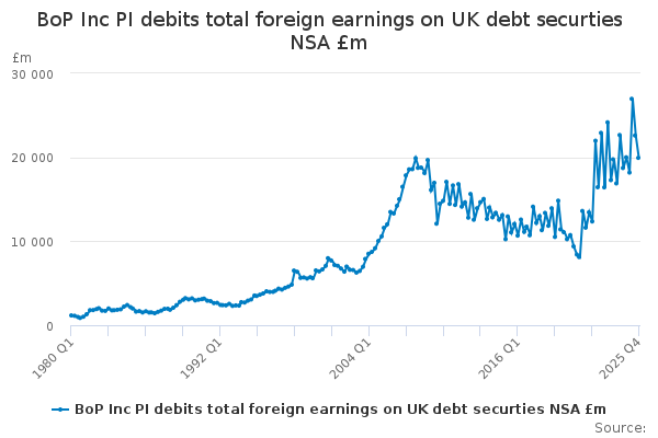 Download this time seriesBoP Inc PI debits total foreign earnings on UK debt securties NSA £m