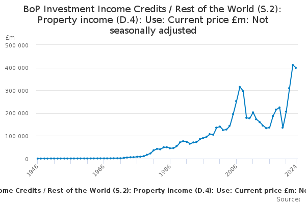 Download this time seriesBoP Investment Income Credits / Rest of the World (S.2): Property income (D.4): Use: Current price £m: Not seasonally adjusted