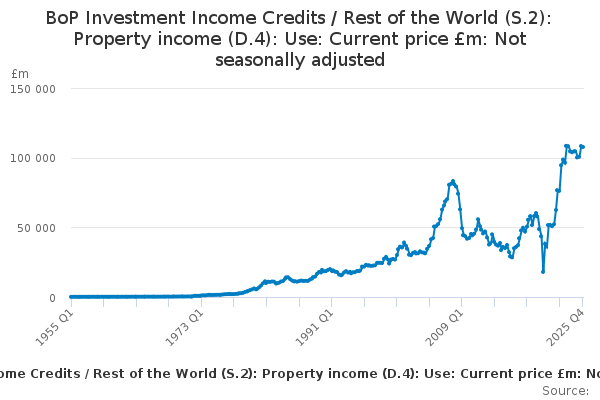 Download this time seriesBoP Investment Income Credits / Rest of the World (S.2): Property income (D.4): Use: Current price £m: Not seasonally adjusted