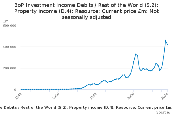 Download this time seriesBoP Investment Income Debits / Rest of the World (S.2): Property income (D.4): Resource: Current price £m: Not seasonally adjusted