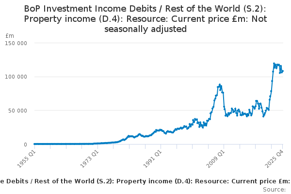 Download this time seriesBoP Investment Income Debits / Rest of the World (S.2): Property income (D.4): Resource: Current price £m: Not seasonally adjusted
