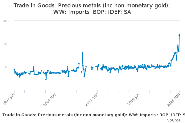 Download this time seriesTrade in Goods: Precious metals (inc non monetary gold): WW: Imports: BOP: IDEF: SA