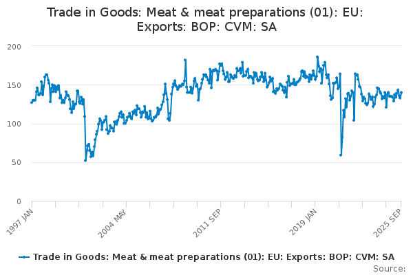 Download this time seriesTrade in Goods: Meat & meat preparations (01): EU: Exports: BOP: CVM: SA