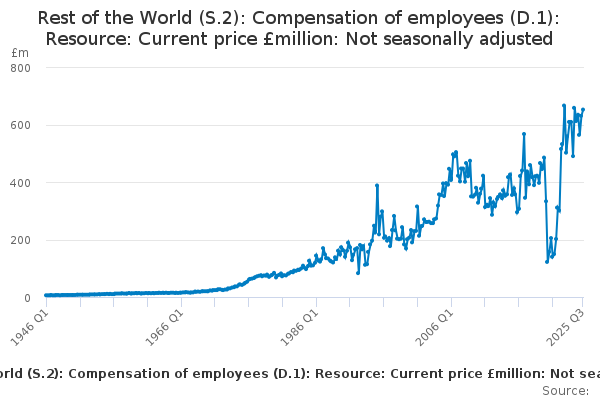 Download this time seriesRest of the World (S.2): Compensation of employees (D.1): Resource: Current price £million: Not seasonally adjusted