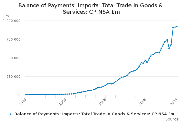 Download this time seriesBalance of Payments: Imports: Total Trade in Goods & Services: CP NSA £m
