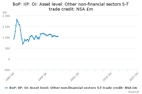 Download this time seriesBoP: IIP: OI: Asset level: Other non-financial sectors S-T trade credit: NSA £m