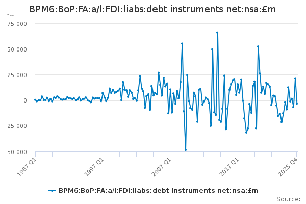 Download this time seriesBPM6:BoP:FA:a/l:FDI:liabs:debt instruments net:nsa:£m