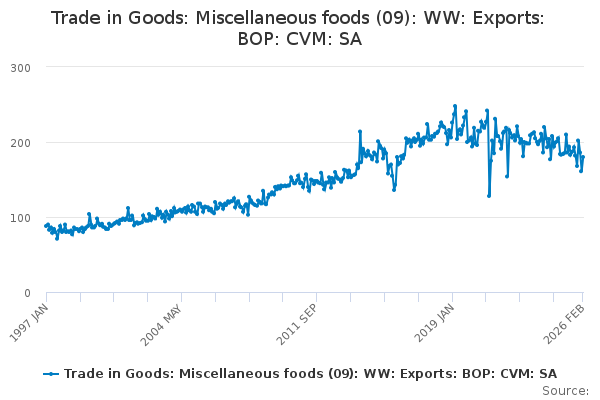 Download this time seriesTrade in Goods: Miscellaneous foods (09): WW: Exports: BOP: CVM: SA