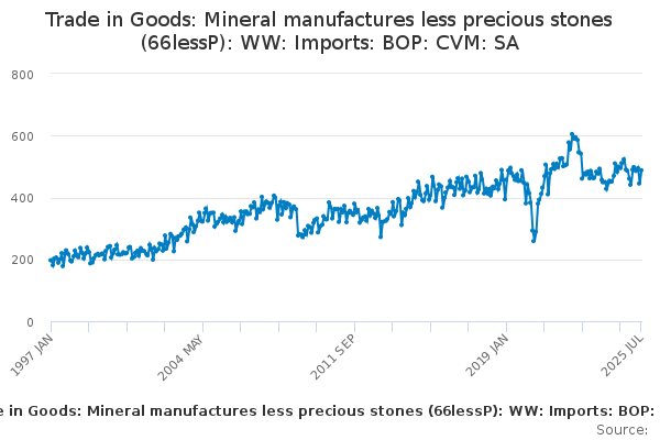 Download this time seriesTrade in Goods: Mineral manufactures less precious stones (66lessP): WW: Imports: BOP: CVM: SA