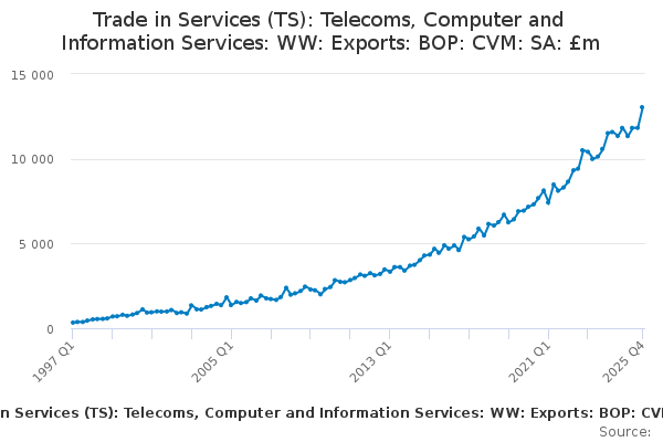 Download this time seriesTrade in Services (TS): Telecoms, Computer and Information Services: WW: Exports: BOP: CVM: SA: £m