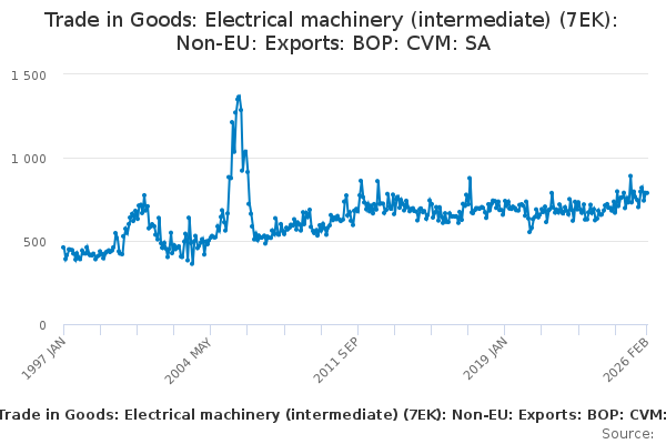 Download this time seriesTrade in Goods: Electrical machinery (intermediate) (7EK): Non-EU: Exports: BOP: CVM: SA