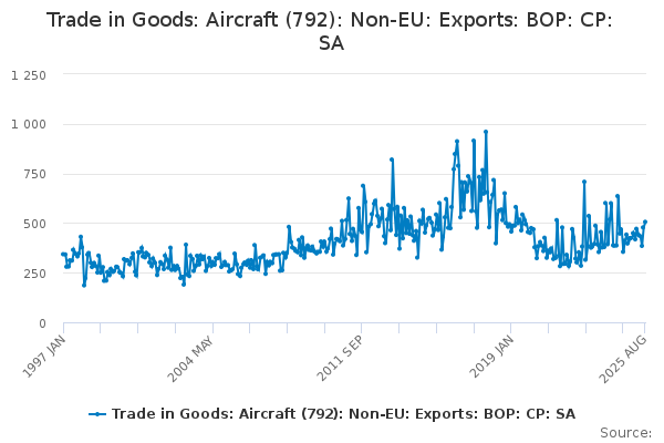 Download this time seriesTrade in Goods: Aircraft (792): Non-EU: Exports: BOP: CP: SA