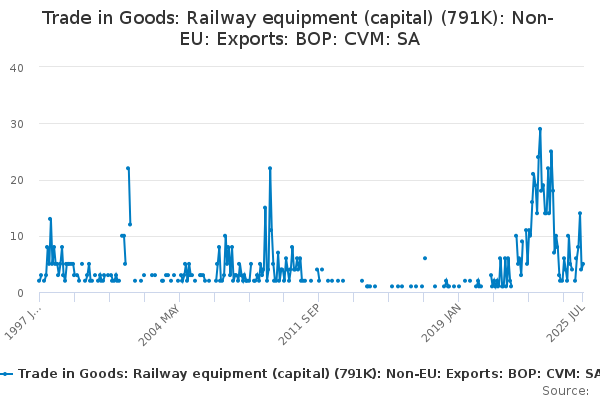 Download this time seriesTrade in Goods: Railway equipment (capital) (791K): Non-EU: Exports: BOP: CVM: SA