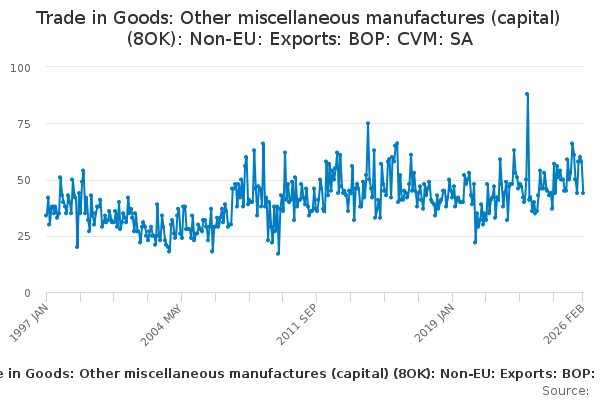 Download this time seriesTrade in Goods: Other miscellaneous manufactures (capital) (8OK): Non-EU: Exports: BOP: CVM: SA