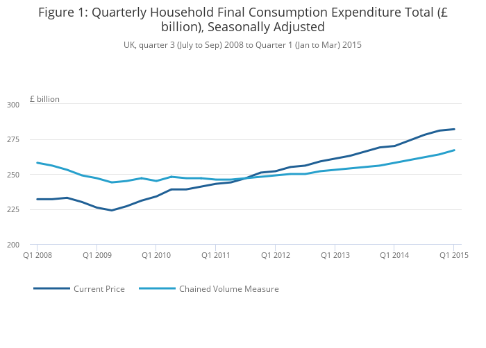 The volume measure provides an estimate of the amount of goods and services purchased by households. In quarter 1 2015 (Jan to Mar 2015), it increased by 0.9%. The current price value of household spending (inflation included) shows how much UK households spent. In quarter 1 2015 (Jan to Mar 2015), it increased by 0.2% compared with Q4 2014 (Oct to Dec 2014). Figure 1 compares the levels of current price and volume spending from 2008 onwards.