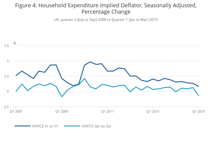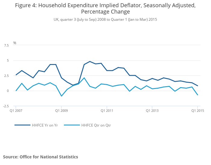 The household expenditure implied deflator fell by 0.7% in Q1 2015 (Jan to Mar 2015) compared with the previous quarter (Oct to Dec 2014)