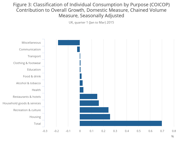 The largest negative contribution to growth over this quarter can be seen in ‘Miscellaneous goods and services’ which has fallen by 1.4% in volume terms. This is driven by decreased spending on ‘Life insurance’, which has fallen by 13.9%, reversing the increase in the previous quarter (Oct to Dec 2014). ‘Dwelling insurance’ has also fallen compared with Q4 2014 (Oct to Dec 2014) decreasing by 7.2%.
