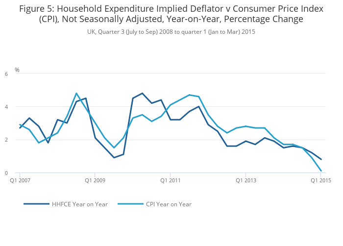 This quarter, quarter 1 (Jan to Mar 2015) the seasonally adjusted household expenditure measure of prices, the implied deflator, fell by 0.7%. In addition to the effect of falling prices in some areas of expenditure in the latest quarter, particularly ‘Food and drink’ and ‘Transport’, the impact of the alignment of the household expenditure rental series with the CPIH deflator has subdued the level of current price data since 2012.