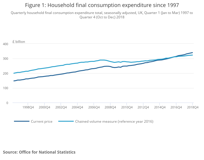 In Quarter 4 (Oct to Dec) 2018, household spending (adjusted for inflation) grew by 0.3% compared with Quarter 3 (July to Sept) 2018.