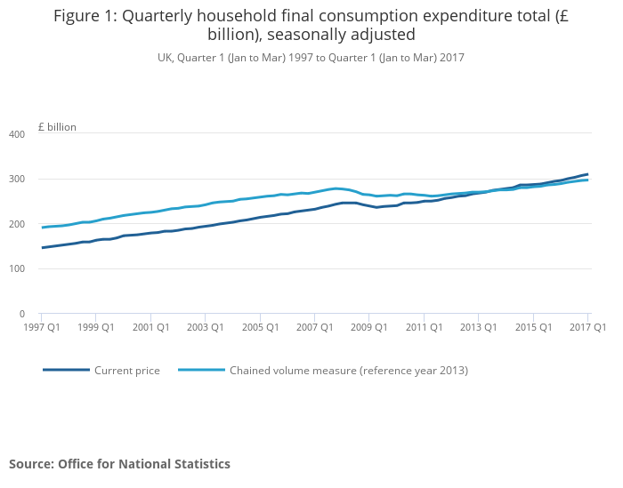 In Quarter 1 (Jan to Mar) 2017, the chained volume measure of household spending increased by 0.4%. The current price value of household spending increased by 0.9% compared with Quarter 4 (Oct to Dec) 2016. Figure 1 shows the levels of current price and volume spending from Quarter 1 1997 onwards.