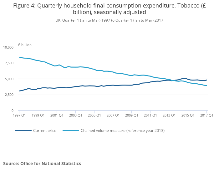 Between Quarter 1 (Jan to Mar) 1997 and Quarter 1 2017, household spending on tobacco products fell by 53.0% in volume terms, yet it has grown by 56.9% in current prices. This indicates that while households are spending increasingly more money on tobacco products, they are getting less for their money. Figure 4 displays the paths of current price and chained-volume-measure spending on tobacco products over time.