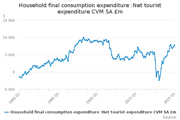 Download this time seriesHousehold final consumption expenditure :Net tourist expenditure CVM SA £m