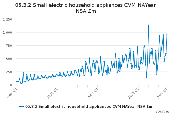 Download this time series05.3.2 Small electric household appliances CVM NAYear NSA £m