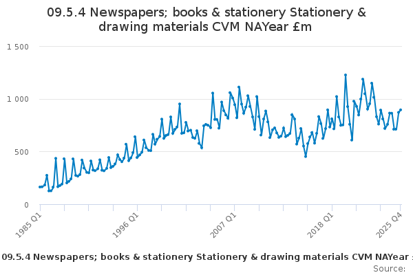 Download this time series09.5.4 Newspapers; books & stationery Stationery & drawing materials CVM NAYear £m
