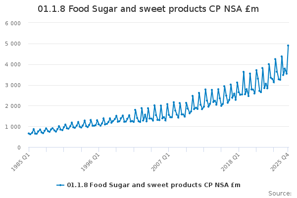Download this time series01.1.8 Food Sugar and sweet products CP NSA £m