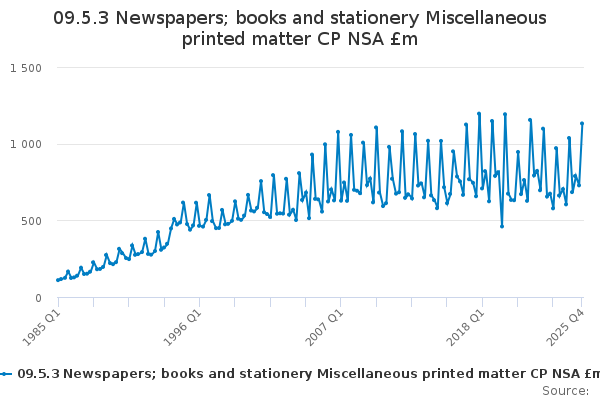 Download this time series09.5.3 Newspapers; books and stationery Miscellaneous printed matter CP NSA £m