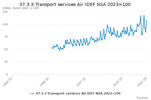 Download this time series07.3.3 Transport services Air IDEF NSA 2023=100