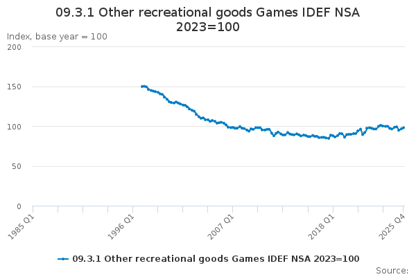 Download this time series09.3.1 Other recreational goods Games IDEF NSA 2023=100