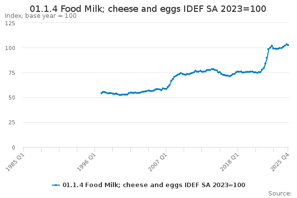 Download this time series01.1.4 Food Milk; cheese and eggs IDEF SA 2023=100