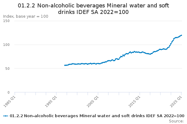 Download this time series01.2.2 Non-alcoholic beverages Mineral water and soft drinks IDEF SA 2023=100