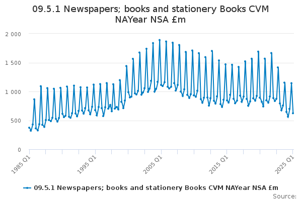 Download this time series09.5.1 Newspapers; books and stationery Books CVM NAYear NSA £m