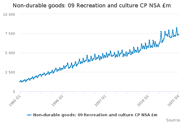 Download this time seriesNon-durable goods: 09 Recreation and culture CP NSA £m