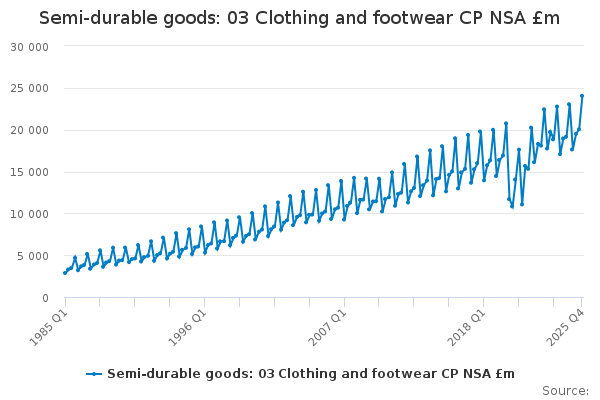 Download this time seriesSemi-durable goods: 03 Clothing and footwear CP NSA £m