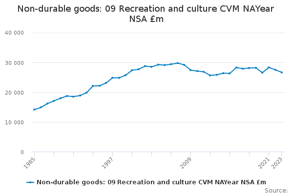 Download this time seriesNon-durable goods: 09 Recreation and culture CVM NAYear NSA £m