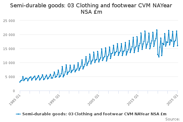 Download this time seriesSemi-durable goods: 03 Clothing and footwear CVM NAYear NSA £m