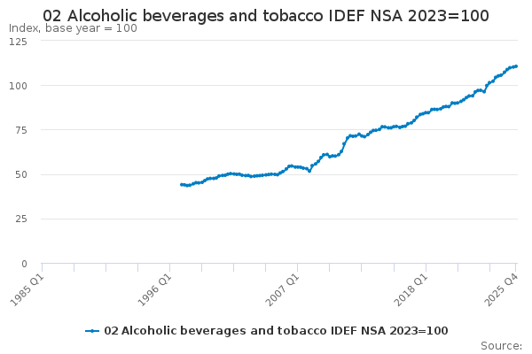Download this time series02 Alcoholic beverages and tobacco IDEF NSA 2023=100