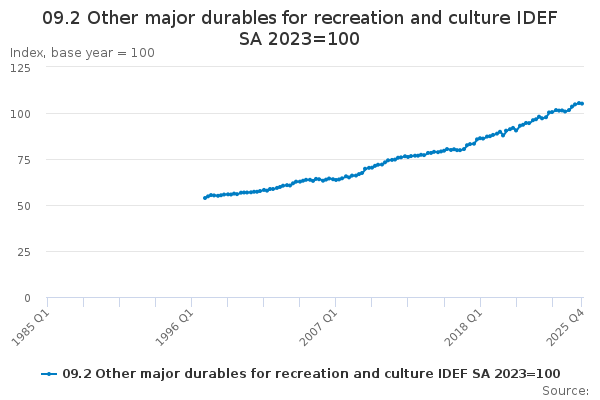 Download this time series09.2 Other major durables for recreation and culture IDEF SA 2023=100