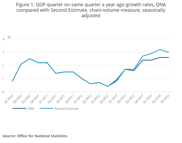The Quarterly National Accounts confirmed that the UK economy grew at an unrevised rate of 0.7% in Q3 2014, contributing to annual growth of 2.6%. This is the seventh successive quarter of output growth and the longest sustained run of quarterly growth since the onset of the economic downturn in 2008.