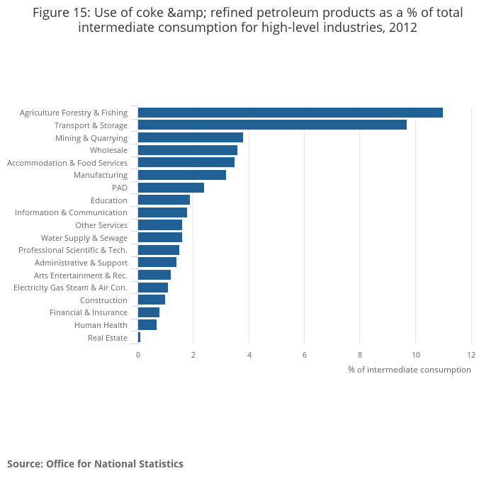 Figure 15: Use of coke & refined petroleum products as a % of total intermediate consumption for high-level industries, 2012