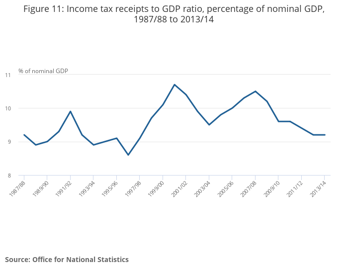 Figure 11: Income tax receipts to GDP ratio, percentage of nominal GDP, 1987/88 to 2013/14