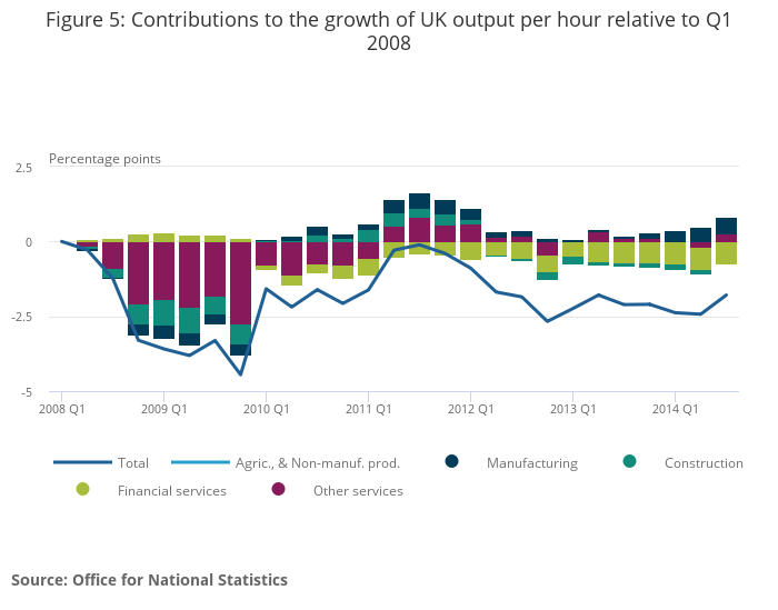Figure 5: Contributions to the growth of UK output per hour relative to Q1 2008