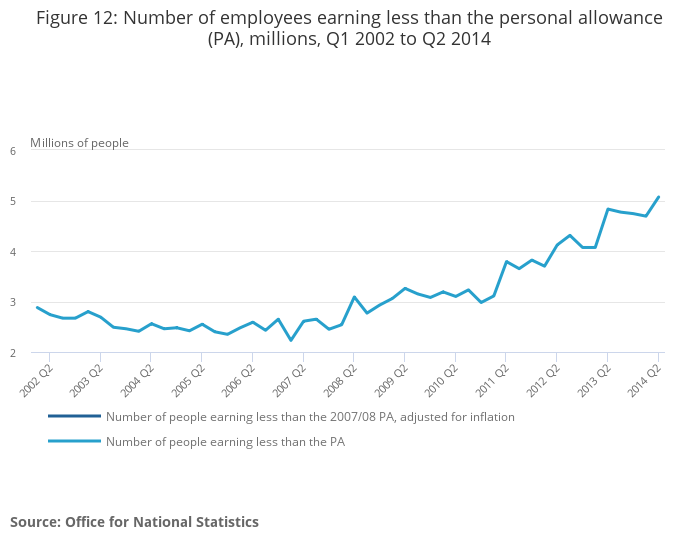 Figure 12: Number of employees earning less than the personal allowance (PA), millions, Q1 2002 to Q2 2014