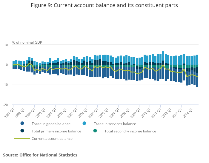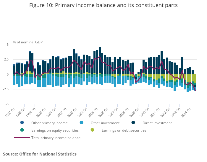 The recent publication of the United Kingdom Economic Accounts - Q3 2014 showed interesting developments in the current account balance and the net international investment position. Latest figures show the current account deficit widening to 6.0% of nominal GDP, representing the joint largest deficit since ONS records began in 1955.