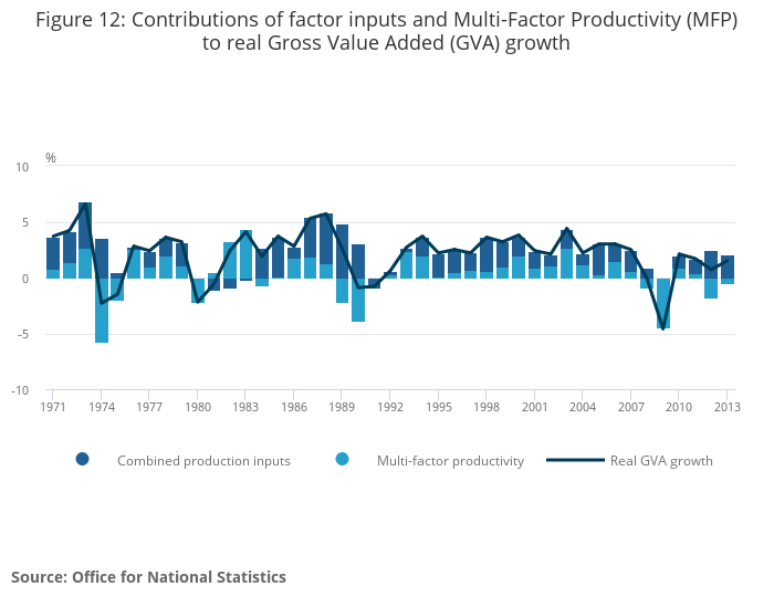 While in the short run measures of labour productivity provide a guide to the efficiency of input use, over the long term firms may also adjust their capital inputs (for example, adding and changing machinery, or updating software), the quality of their labour input (increasing the number of highly-qualified employees) or change their management practices. To help understand the factors driving labour productivity, ONS have recently published estimates of Multi-Factor Productivity (MFP) growth (Multi-factor Productivity (experimental) - Estimates to 2013). These estimates divide output growth into the contributions from the changing use of capital and labour, the contribution of changes in labour quality and a fourth, residual component, which is typically interpreted as capturing technological progress. This is thought to include the effect of changes in management techniques, business processes or the more efficient use of inputs.