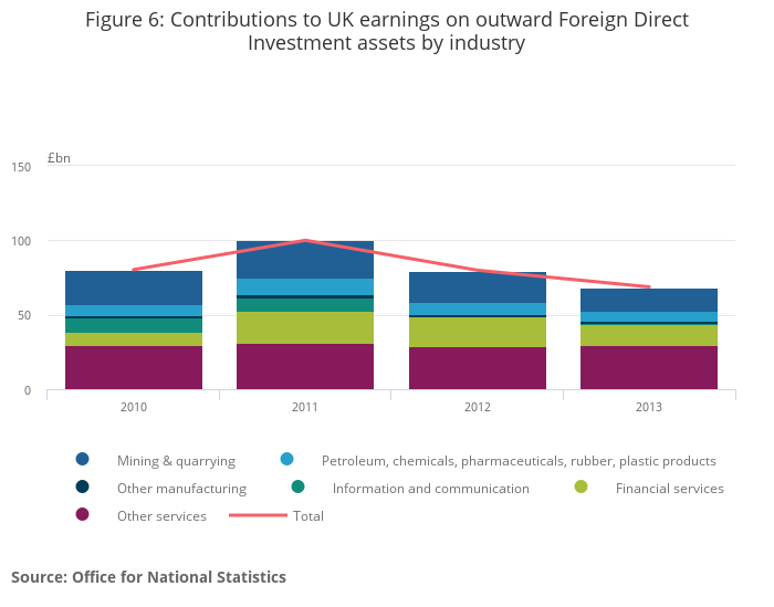 Figure 6 analyses this fall in UK gross FDI income using the recently published directional FDI data (Foreign Direct Investment - 2013). It shows that much of this fall is accounted for by lower earnings on assets held in the financial services, information and communication services, petroleum products, and mining and quarrying industries by the UK overseas.