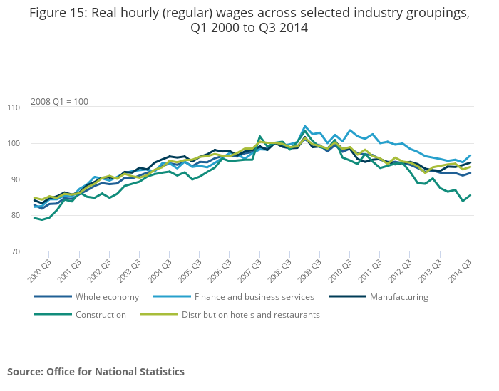 Figure 15: Real hourly (regular) wages across selected industry groupings, Q1 2000 to Q3 2014